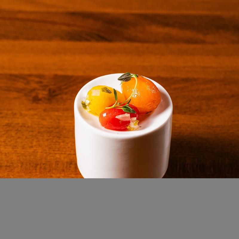 Peeled cherry tomatoes with basil, drizzled with sweet and sour seasoning.